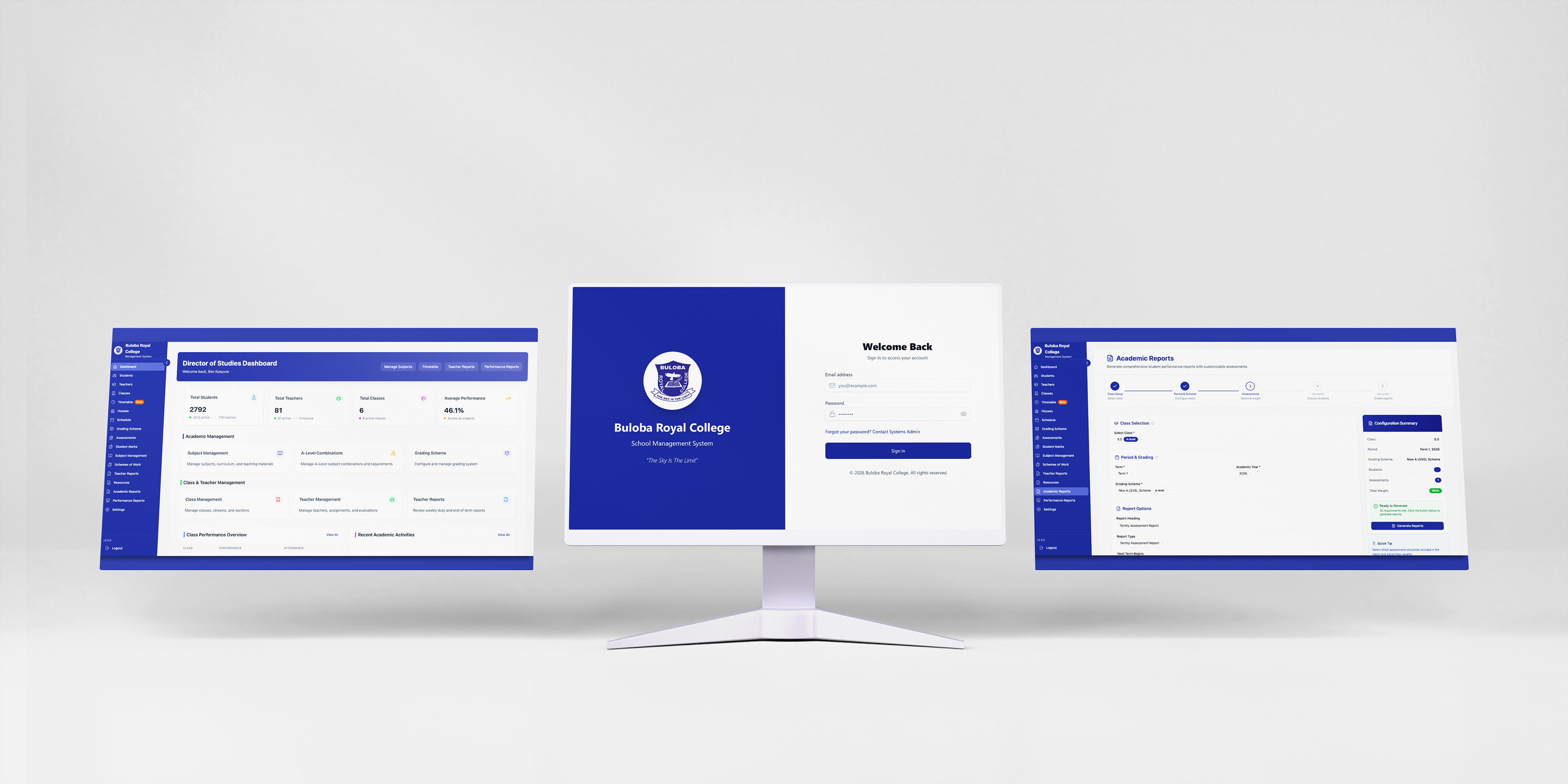 A school administration portal developed for Buloba Royal College, designed to provide secure account access and a structured way to manage academic and operational workflows. The system supports key functions such as assessments, student records, and reporting, all within a clear and organized interface.